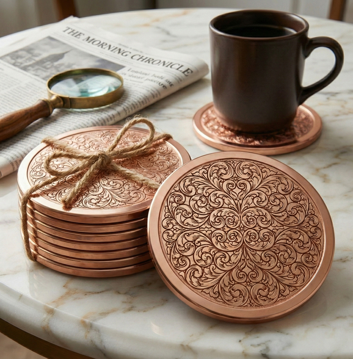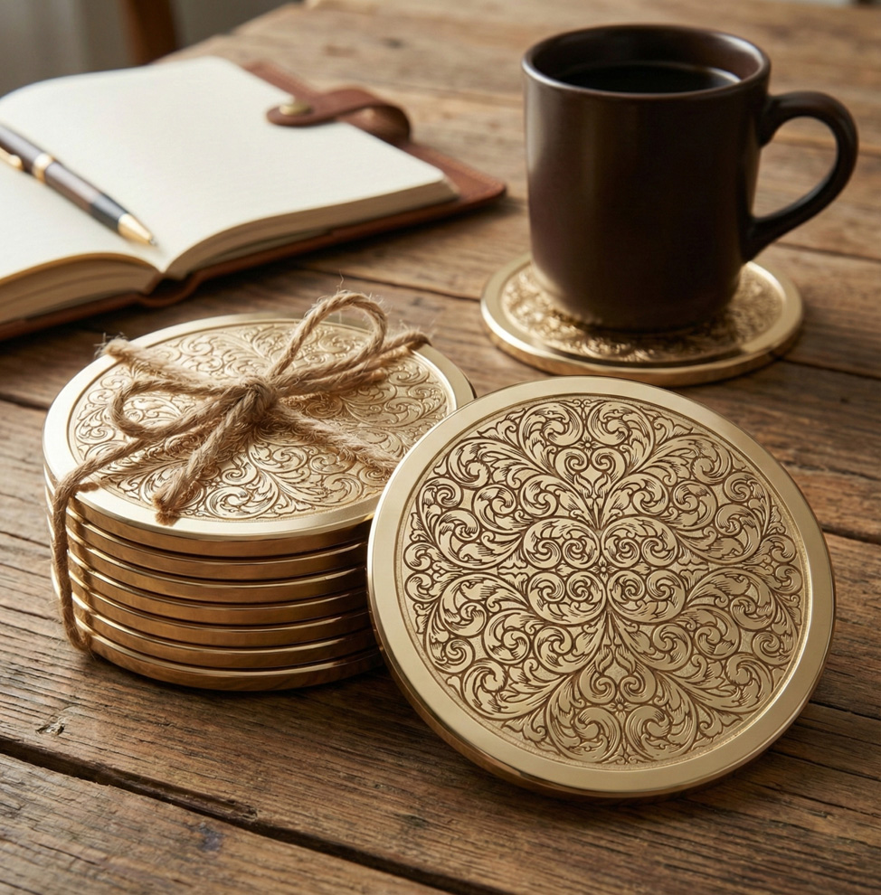 Where Vintage Charm Meets Modern Luxury Imagine sitting down to your morning coffee or evening tea, not just placing your mug on a coaster, but on a piece of art. These aren’t just coasters; they are jewelry for your table. Bathed in a rich, “Champagne Gold” finish and deeply engraved with timeless floral scrollwork, they instantly transform a cluttered desk or plain dining table into a scene of sophisticated elegance. The light plays across the metallic surface, adding a warm, welcoming glow to your room that whispers “luxury” without saying a word.
