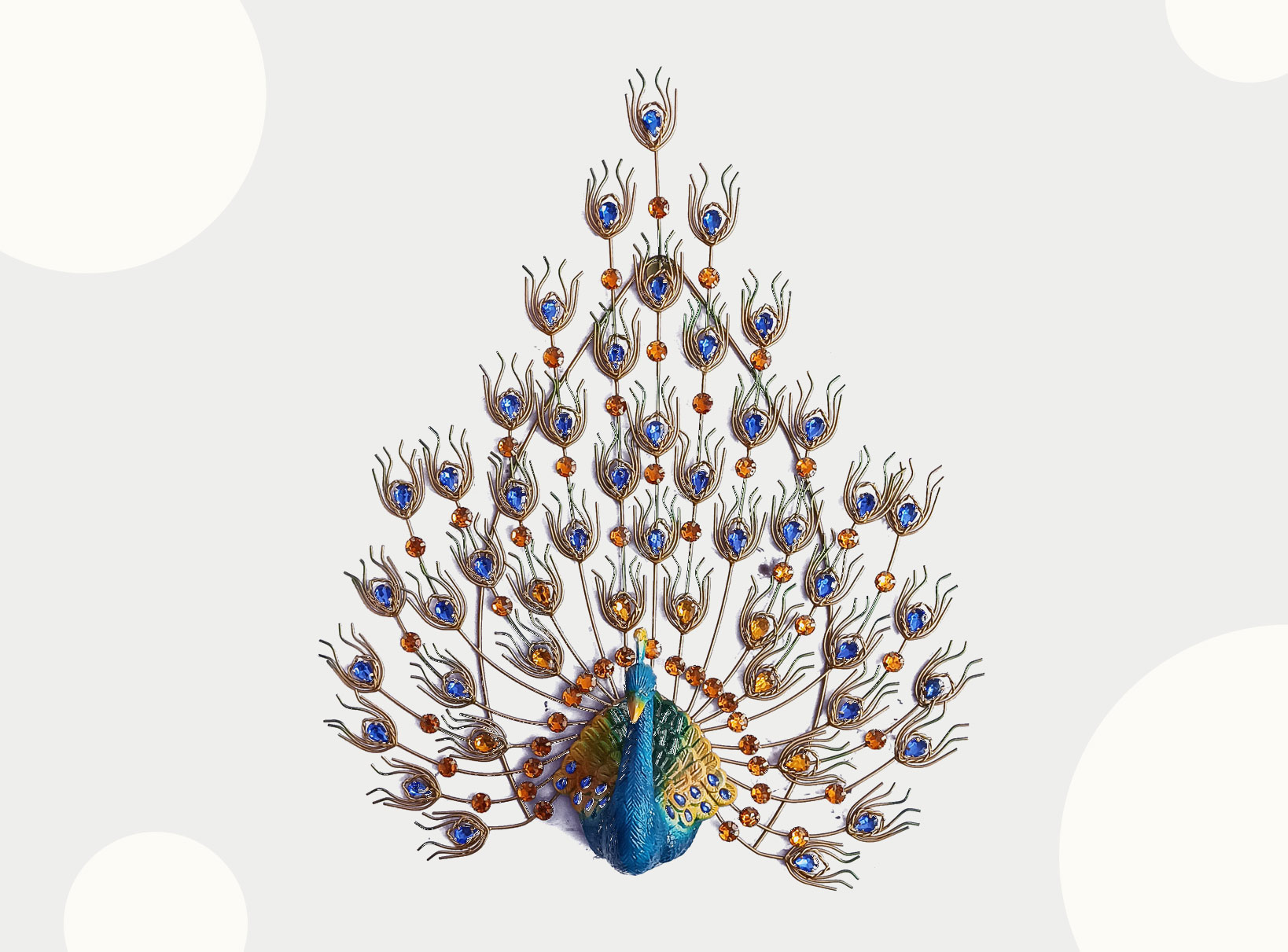 A Symphony of Color and Light Transform your blank walls into a canvas of elegance with this Royal Jeweled Peacock Wall Decor. Unlike heavy, solid wall plates, this piece features an artistic wireframe design that feels light and modern. The intricate metalwork spreads out like a fan, dotted with sparkling crystals in shades of sapphire blue and amber gold. It captures the essence of a peacock dancing in the rain, bringing a sense of joy and vibrancy to your home interiors.