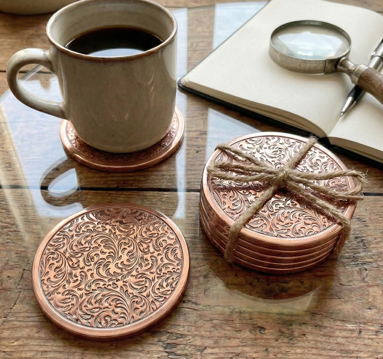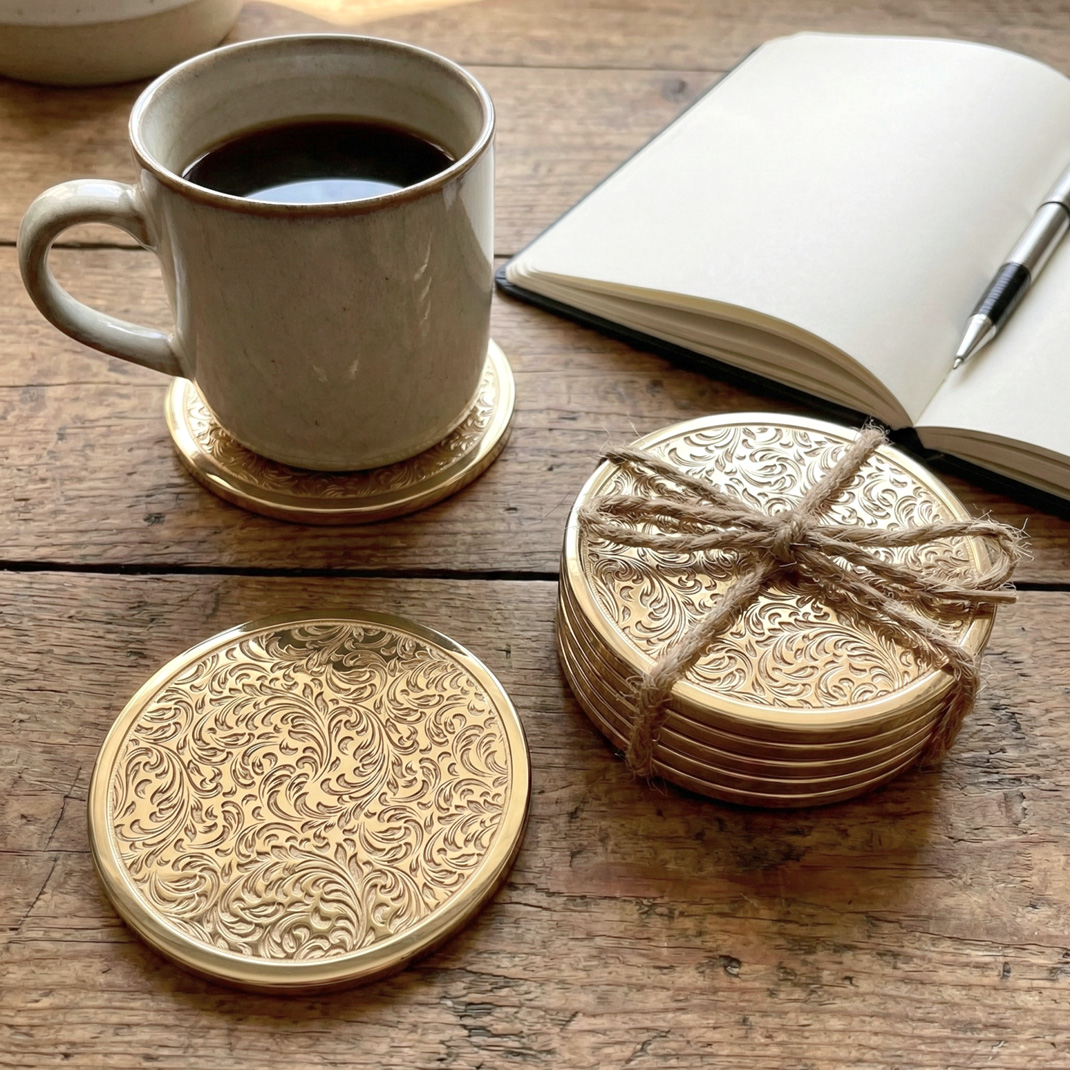 Imagine a slow Sunday morning where the golden light hits your study table just right. You set down your favorite ceramic mug, and instead of a clatter, there’s a soft, satisfying click against hand-finished metal. These aren’t just coasters; they are the quiet architects of your home’s ambiance. The intricate floral engravings catch the light, adding a layer of depth and texture to your workspace that whispers of curated taste and a life well-lived.