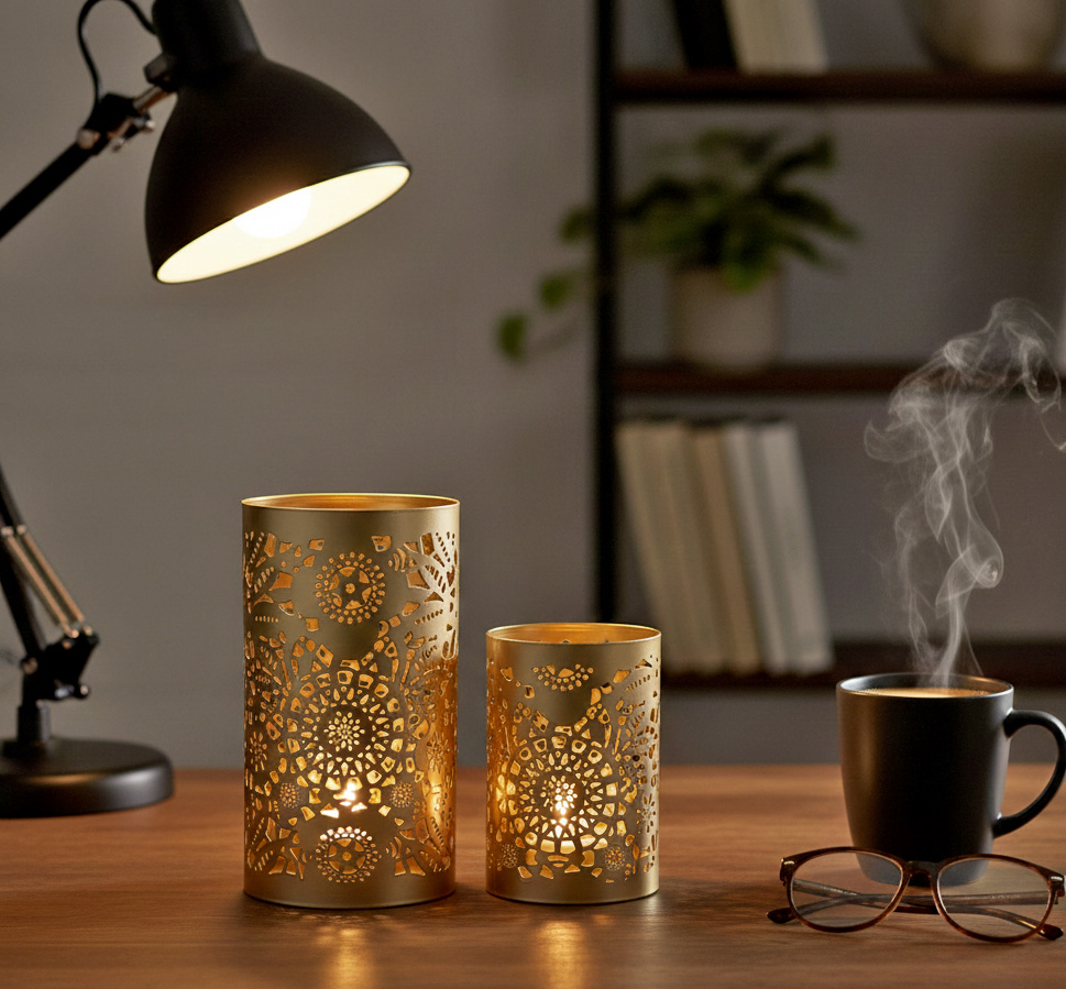 Turn Your Desk into a Sanctuary Close your laptop. Pour a fresh cup of coffee. Strike a match. As the flame catches inside the Mandala Glow Votives, your workspace transforms. The “Champagne Gold” finish catches the ambient light of your desk lamp, while the laser-cut geometric patterns sculpt the candlelight into a warm, soothing embrace. This isn’t just decor; it is a mood shifter. It signals the transition from the hustle of the day to the serenity of the evening, bringing a “Golden Hour” glow to your room, any time you choose.
