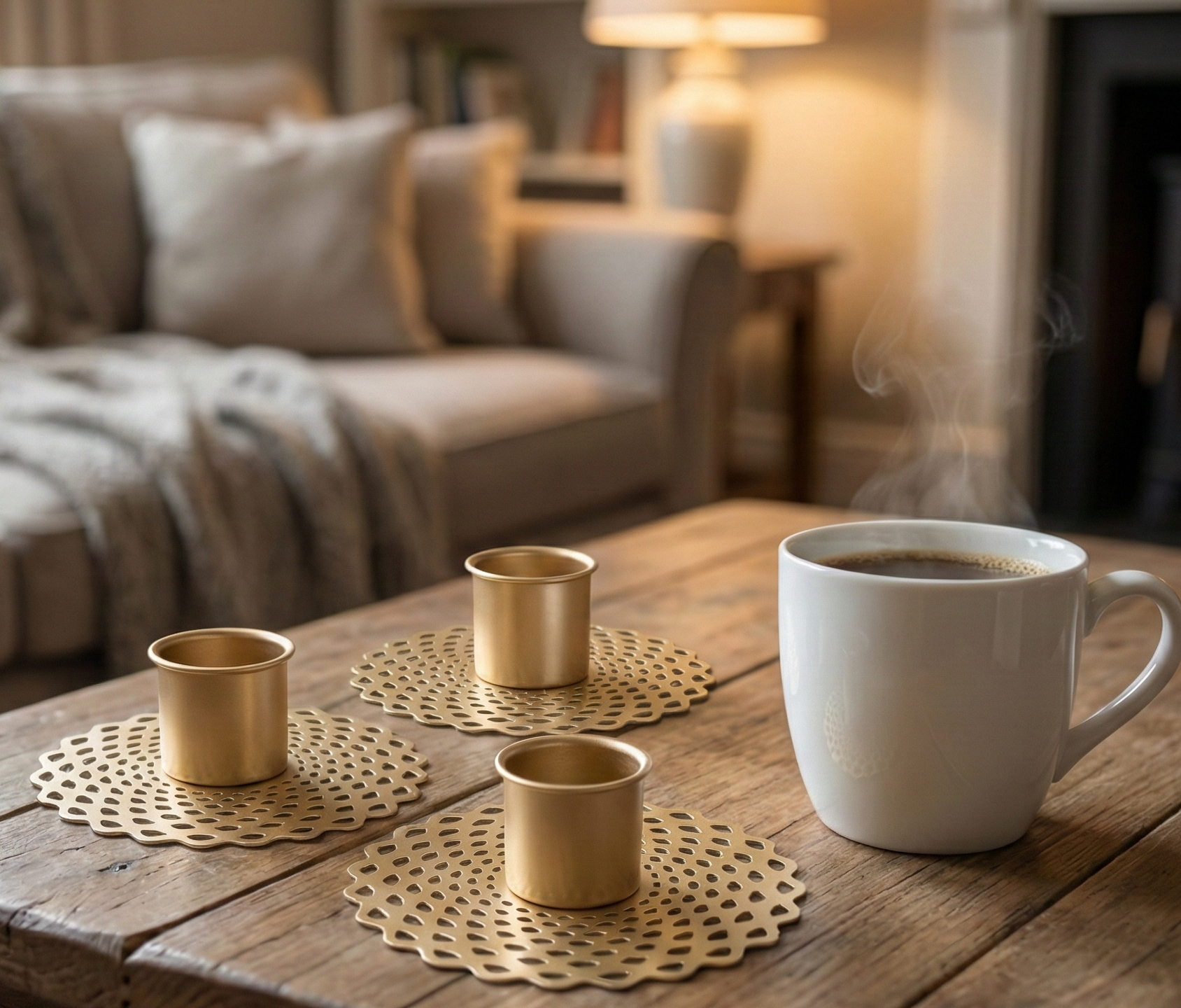 A Companion for Your Quiet Moments Imagine a quiet evening at your study table or a slow Sunday morning in the living room. These holders are designed to sit perfectly beside your favorite coffee mug, adding a serene, golden warmth to your workspace or reading nook. Whether you are powering through a late-night project or enjoying a moment of pause, the soft flicker of candlelight against the sleek gold metal creates an ambiance of focus and tranquility.