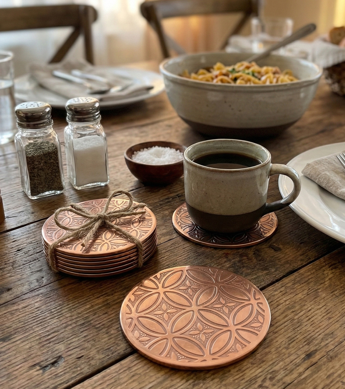 The Art of Everyday Living Imagine the morning sun streaming across your dining table, catching the warm, glowing glint of antique copper. You place your steaming cup of coffee down, not on a flimsy mat, but on a piece of art. These aren’t just coasters; they are a statement of style. Designed for the tastemaker who appreciates the blend of vintage warmth and contemporary chic, our Embossed Metal Coasters bring a touch of the “royal atelier” to your modern home. The minimalist geometric floral pattern bridges the gap between old-world charm and sleek modern decor, ensuring your space looks curated, not cluttered.