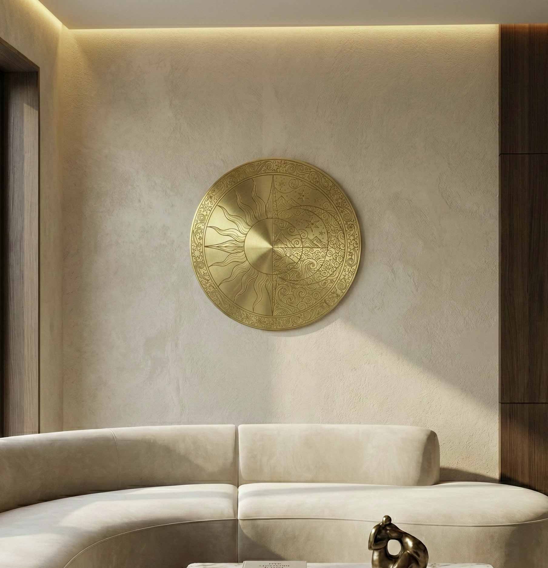 Create a Sanctuary of Balance In a busy world, your home should be your sanctuary. This “Sun & Moon” wall art is designed to instill a sense of balance and harmony in your space. The warm Champagne Gold finish acts as a neutral yet captivating accent, perfect for styling a “Boho-Modern” bedroom or adding a touch of mysticism to a contemporary living room. It pairs effortlessly with other natural elements like wooden furniture, indoor plants, and soft textiles.