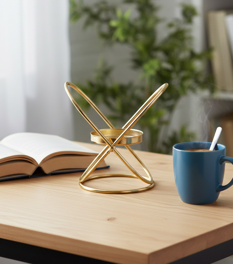 Imagine a desk that does more than just hold a laptop. As the sun dips below the horizon, you strike a match and the room softens. This minimalist gold tealight holder isn’t just an accessory; it is an anchor for your evening ritual. Its sleek, intersecting lines create a delicate dance of shadows, instantly turning a cluttered workspace into a serene sanctuary where focus and calm coexist.