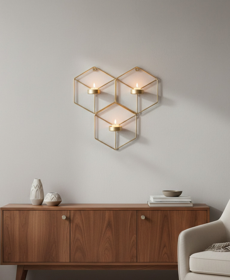 Turn your empty walls into a canvas of light and shadow. This geometric wall sconce redefines modern wall decor by blending the sharp lines of industrial design with the softness of candlelight. The structure—composed of three interlocking wireframe cubes—creates a fascinating visual rhythm that feels both mathematical and artistic. It is perfect for the homeowner who wants their walls to speak, acting as a piece of modern sculpture that doesn’t just hang there, but interacts with the room.