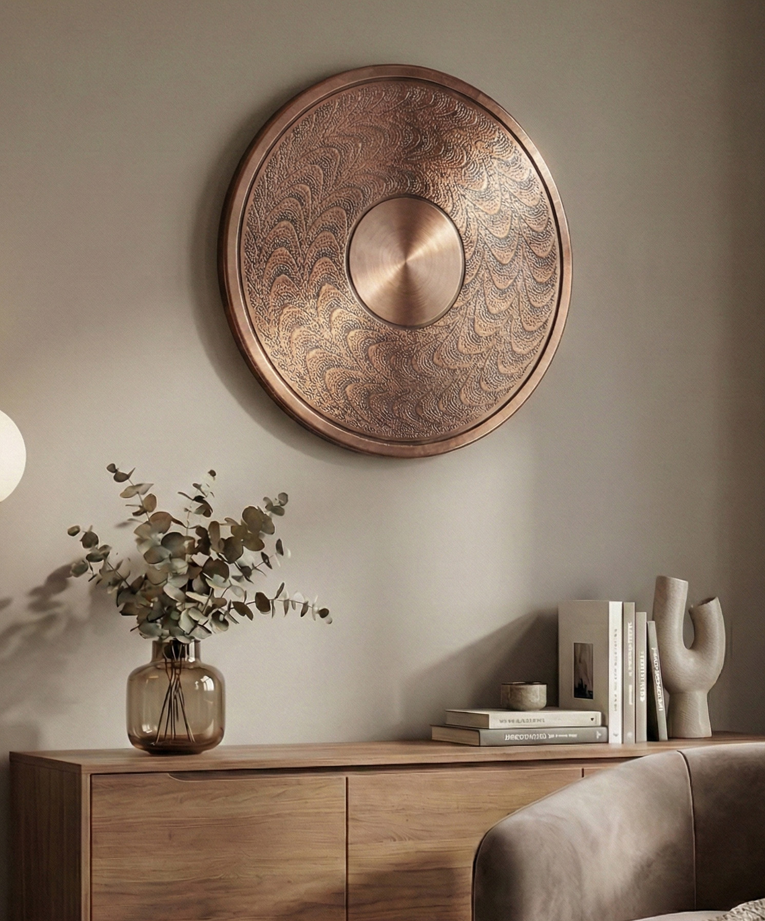 A Sophisticated Backdrop for Your Work Create a workspace that feels grounded and inspiring. This wall plate is the perfect companion for a study table or home office. Imagine it mounted on the wall behind your desk—its warm metallic glow pairs beautifully with a steaming coffee mug and your favorite books, creating a “dark academia” or “modern rustic” aesthetic. It adds character to your video calls and makes your working environment feel curated and professional.